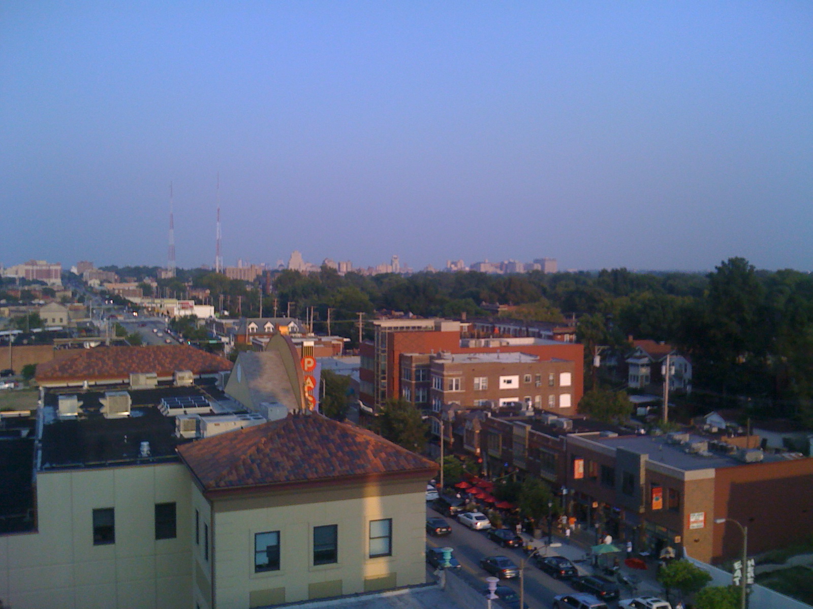 This view is from a new boutique hotel near the western city limits of St. Louis. It is called the Moonrise Hotel and the picture was taken while on the rooftop terrace of the hotel where there is an outdoor bar and lounge area. The buildings near the skyline are in downtown St. Louis where the Gateway Arch (you most likely can’t see it in this small photo) is positioned to the right of the two radio towers.