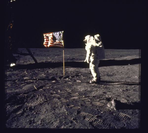Astronaut Edwin Aldrin saluting American flag after being second man on moon during Apollo II mission, July 1969