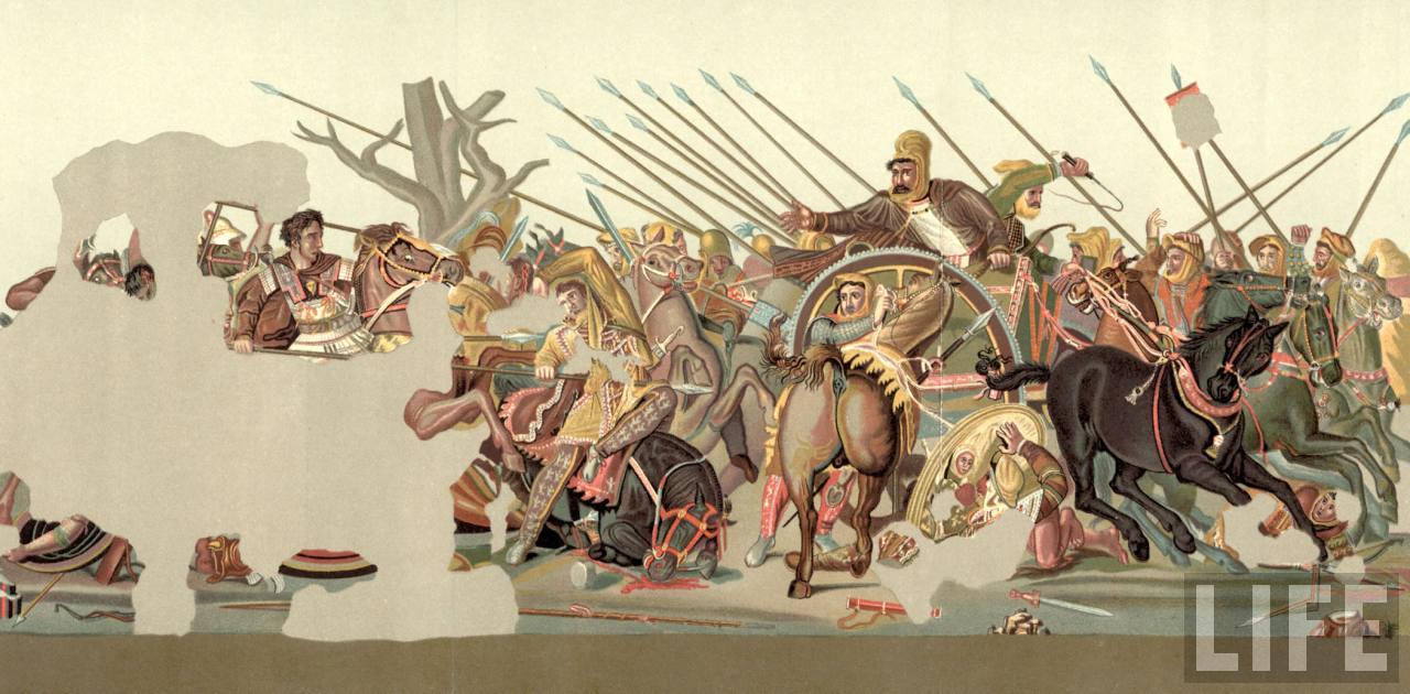 A "life-mosaic" can be damaged just like this "Damaged Roman mosaic depicting Alexander the Great (L) engaged in battle w. a chariot riding Darius III, king of Persia, at Issus"