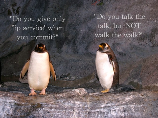 What do you do when you commit (pledge or obligate yourself) to something? Do you give only “lip service” when you commit? Do you “talk the talk, but not ‘walk the walk’?” What does making a commitment mean? From your point of view, does making a commitment really matter? The previous questions are all focused on commitment. If you choose to honestly answer the questions, then they can provide some insight into your point of view regarding the act of committing.