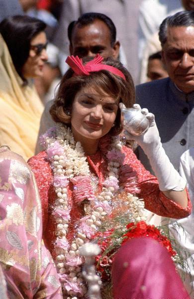 First Lady Jackie Kennedy holding a silver encased coconut to her forehead in the Rajasthani mark of luck and RESPECT as she is welcomed at the Jaipur Airport during her tour of India in March 1962
