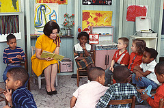 The photograph shows Lady Bird Johnson, the First Lady, reading to children enrolled in Project Head Start at Kemper School in Washington, DC. 03/19/1966